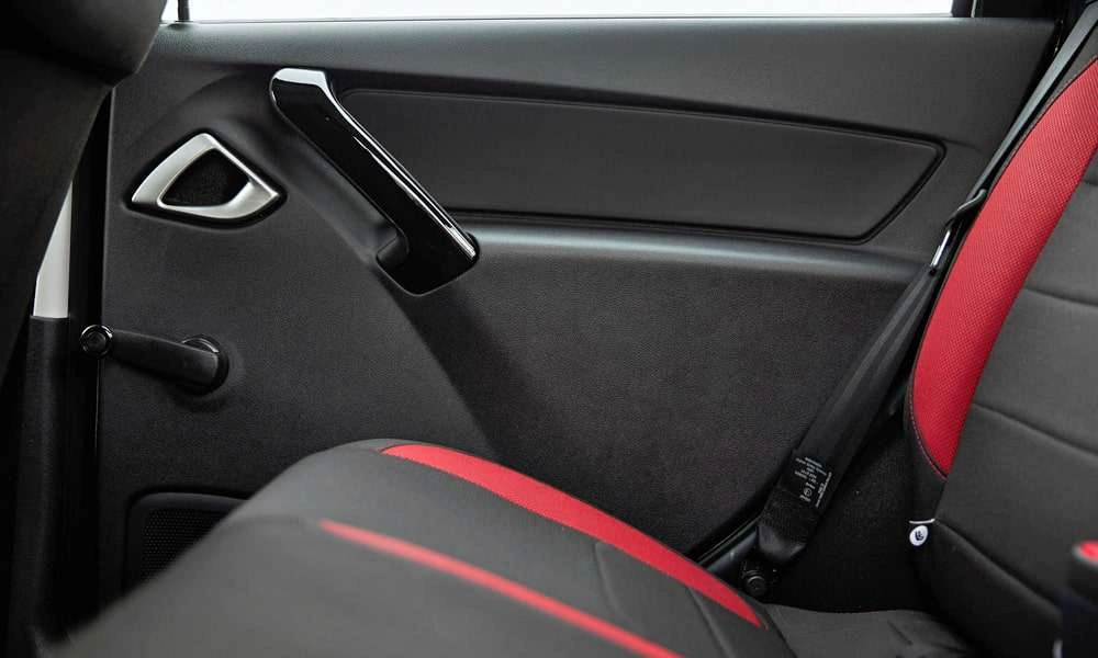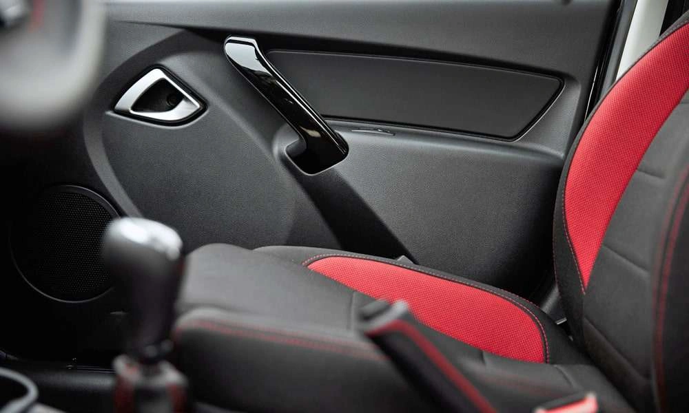 Обивка сидений ткань. Цвет черный с красными элементами